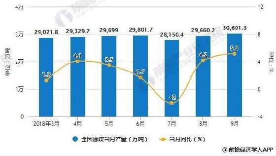 煤炭行業(yè)發(fā)展概況分析 煤炭是我國主體能源和基礎(chǔ)產(chǎn)業(yè),長期以來受到黨和政府的高度重視。在相當(dāng)長一段時間內(nèi),甚至從長遠(yuǎn)來講,我國還是以煤為主的能源格局,只不過比例會下降,我們對煤的注意力不要分散。我們正在壓縮煤炭比例,但國情還是以煤為主,我國煤炭資源豐富,在發(fā)展新能源、可再生能源的同時,還要做好煤炭這篇大文章。既然要做好煤炭這篇大文章,就要研究做什么樣的煤炭大文章,怎樣做好煤炭大文章這個重大時代命題。 9月原煤產(chǎn)量統(tǒng)計分析 據(jù)前瞻產(chǎn)業(yè)研究院發(fā)布的《煤炭行業(yè)發(fā)展趨勢與投資決策分析報告》統(tǒng)計數(shù)據(jù)顯示,2018年3-6月全國原煤產(chǎn)量呈小幅度增長趨勢,2018年6月全國原煤產(chǎn)量為29801.7萬噸,同比增長1.7%。2018年7月全國原煤產(chǎn)量下降,2018年8-9月全國原煤產(chǎn)量回升;2018年9月全國原煤產(chǎn)量為30601.3萬噸,同比增長5.2%。2018年1-9月全國原煤產(chǎn)量為258447萬噸,同比增長5.1%。