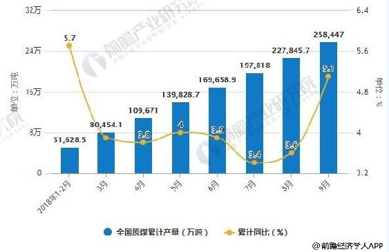 2018年1-9月全國原煤產(chǎn)量統(tǒng)計及增長情況