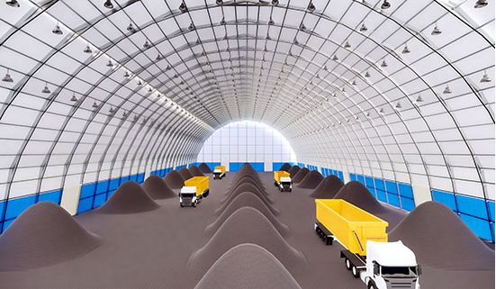 最近,麗日篷房為煤炭行業(yè)打造儲煤棚篷房,幫助傳統(tǒng)煤炭行業(yè)更新設備和儲藏方式,采用高強度鋁合金結構,為那些儲煤場建造更高效環(huán)保的建筑物來儲存煤炭。這種裝配式儲煤棚屬于模塊化結構,主要結構采用鋁合金框架和PVC雙面涂層防水纖維布,在工廠預制生產(chǎn),用CNC數(shù)控機床按照規(guī)格尺寸精準加工,運輸?shù)浆F(xiàn)場后快速安裝并即刻投入使用。比起固定建筑的建造工期,至少縮短2-4個月,大大減少時間和經(jīng)濟成本。 麗日生產(chǎn)的鋁合金結構封閉式的新型儲煤棚是響應國家環(huán)保政策的舉措,高性能鋁合金可讓儲煤棚結構更加穩(wěn)固耐用,而表面覆膜PVDF技術的PVC篷布也具備表面抗?jié)B吸、自潔性,可保證長久良好的使用狀態(tài)。內(nèi)部采用無中柱大空間結構設計,很大程度的提高室內(nèi)空間利用率,而且麗日篷房提供的拱形結構儲煤棚最大可做到跨度80米,頂高35米,這樣的大空間結構優(yōu)勢可方便貨車進出自由卸貨無困難。
