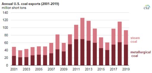 根據(jù)美國(guó)能源信息署的年度煤炭報(bào)告,2019年美國(guó) 煤炭出口下降至9300萬(wàn)短噸,比上年下降20%。美國(guó)出口了冶金煤和動(dòng)力煤,2019年兩者均下降。美國(guó)動(dòng)力煤出口受全球煤炭需求下降的影響,較2018年下降了30%;冶金煤的跌幅較為溫和,為12%。