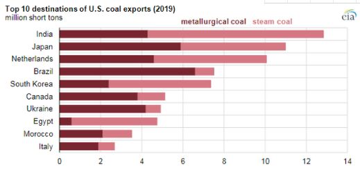2019年,印度,日本,荷蘭,巴西和韓國(guó)是美國(guó)煤炭出口的五大目的地。這些國(guó)家合起來(lái)占美國(guó)煤炭出口總量的53%。 2019年,印度約有75%的電力是通過(guò)燒煤發(fā)電的,其中85%的電力用于國(guó)內(nèi)生產(chǎn),其余則是進(jìn)口的。印度繼續(xù)需要相對(duì)大量的動(dòng)力煤進(jìn)口。 2019年,印度從美國(guó)接收了810萬(wàn)短噸的動(dòng)力煤,使其連續(xù)三年成為美國(guó)煤炭出口的最大目的地。2019年美國(guó)對(duì)印度的煤炭總出口為1280萬(wàn)短噸。 日本的煤炭消耗幾乎在發(fā)電和冶金煤之間平均分配。盡管日本的整體鋼鐵產(chǎn)量下降了近5%,但日本從美國(guó)的煤炭進(jìn)口仍保持在2018年的水平。 荷蘭是美國(guó)煤炭出口的第三大目的地,為1000萬(wàn)短噸,不過(guò)荷蘭是歐盟其他地區(qū)的主要轉(zhuǎn)運(yùn)中心,并且在2019年,該國(guó)從美國(guó)進(jìn)口的大部分煤炭都運(yùn)到了德國(guó)。只有30%的煤炭留在荷蘭國(guó)內(nèi)消費(fèi)。德國(guó)在2019年進(jìn)口了約4000萬(wàn)短噸的煤炭,而1800萬(wàn)短噸直接來(lái)自美國(guó)。 巴西是2019年美國(guó)最大的冶金煤目的地,進(jìn)口量為660萬(wàn)短噸。韓國(guó)是2019年美國(guó)動(dòng)力煤的第三大進(jìn)口國(guó),進(jìn)口量為470萬(wàn)短噸,低于2018年的640萬(wàn)短噸。由于燃煤電廠關(guān)閉以改善空氣質(zhì)量等一系列減排措施,韓國(guó)在2020年對(duì)美國(guó)動(dòng)力煤進(jìn)口量可能會(huì)進(jìn)一步下降。 盡管對(duì)一些主要出口目的地的出口量下降,但是2019年其他一些市場(chǎng)的出口量有所增長(zhǎng)。例如,美國(guó)對(duì)埃及的動(dòng)力煤出口在2019年增長(zhǎng)了28%,主要用于水泥生產(chǎn)。