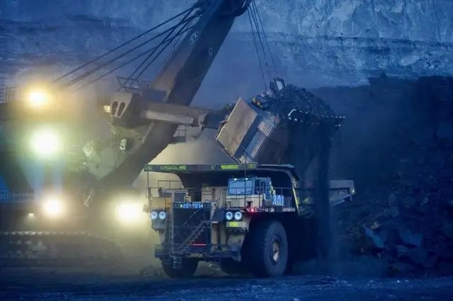 圖為黑岱溝露天煤礦電鏟為卡車裝載煤炭。