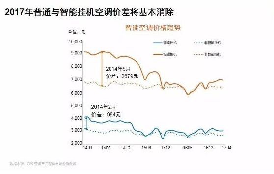 中國空調(diào)行業(yè)已加速向互聯(lián)網(wǎng)轉型 2014年,中國普通掛機空調(diào)與智能掛機空調(diào)價差近千元,柜機價差更是超過2500元,而到2017年價差已經(jīng)基本消除。