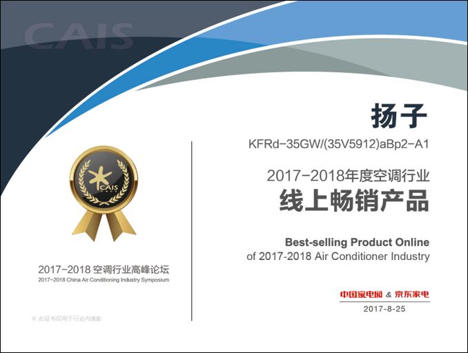 2017年8月25日,主題為“天氣論VS進(jìn)化論”的2017-2018中國空調(diào)行業(yè)高峰論壇在京召開。會(huì)議對(duì)2017冷年以及2018冷年空調(diào)行業(yè)進(jìn)行了盤點(diǎn)與趨勢分析,并對(duì)表現(xiàn)突出的品牌及產(chǎn)品進(jìn)行了集中表彰。其中,揚(yáng)子空調(diào)成功獲得“2017-2018中國空調(diào)行業(yè)節(jié)能標(biāo)桿品牌”,旗下明星產(chǎn)品KFRd-35GW/(35V5912)aBp2-A1、KFRd-52LW/(5211916)aBp2-A1則分別贏得“2017-2018中國空調(diào)行業(yè)線上暢銷產(chǎn)品”,“2017-2018中國空調(diào)行業(yè)創(chuàng)新設(shè)計(jì)產(chǎn)品”的殊榮。
