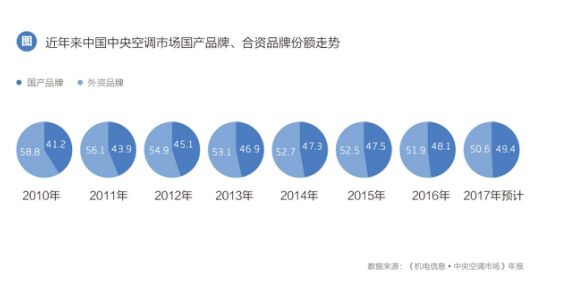 8月下旬,國(guó)內(nèi)家電企業(yè)上市公司中期報(bào)告集中發(fā)布,幾大巨頭業(yè)績(jī)看點(diǎn)頗多。國(guó)產(chǎn)幾大家電企業(yè)無(wú)論是營(yíng)業(yè)收入還是凈利潤(rùn)都呈現(xiàn)大幅增長(zhǎng)態(tài)勢(shì)。 緊跟其后“中國(guó)企業(yè)500強(qiáng)”榜單發(fā)布再次聚焦市場(chǎng)眼球。以海爾、美的、格力領(lǐng)銜的八家家電企業(yè)營(yíng)收總規(guī)模突破8700億元。海爾以2016.08億元領(lǐng)跑,美的以1598.41億元排名101位緊隨其后。 幾大家電巨頭靚麗成績(jī)單的背后,空調(diào)產(chǎn)品扮演著極為重要的角色,特別是過(guò)去的一年,空調(diào)產(chǎn)業(yè)整體上升趨勢(shì)明顯,而其中中央空調(diào)作為近年來(lái)備受矚目的細(xì)分單元,盈利能力和市場(chǎng)增長(zhǎng)速度都有大幅提升。 國(guó)內(nèi)幾大行業(yè)媒體發(fā)布的2017年上半年中央空調(diào)市場(chǎng)報(bào)告顯示,2017年上半年中國(guó)中央空調(diào)市場(chǎng)整體增幅超過(guò)25%,半年容量首次突破400億元關(guān)口,市場(chǎng)信心空前高漲。 其中值得關(guān)注的是,以格力、海爾、美的為代表的國(guó)產(chǎn)品牌占比份額再次提升。公開的數(shù)據(jù)顯示,2010年國(guó)產(chǎn)品牌中央空調(diào)占比41.2%,而到2016年年底,這個(gè)數(shù)字變成了48.1%,進(jìn)展勢(shì)頭不似家用空調(diào)當(dāng)年開疆拓土?xí)r摧枯拉朽,但筆者認(rèn)為改變的力量已經(jīng)形成并積聚。隨著 “國(guó)進(jìn)外退”的整體趨勢(shì)推導(dǎo),國(guó)家對(duì)綠色節(jié)能技術(shù)扶持力度持續(xù)加大,國(guó)產(chǎn)品牌超越外資成為市場(chǎng)主角的趨勢(shì)已然客觀存在。國(guó)內(nèi)幾大中央空調(diào)市場(chǎng)研究機(jī)構(gòu)一致預(yù)測(cè),國(guó)產(chǎn)品牌市場(chǎng)占比將會(huì)在2018年全面超越外資品牌。