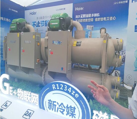 在綠色高效制冷行動展區(qū),現(xiàn)場展示了一臺節(jié)能中央空調(diào)機組