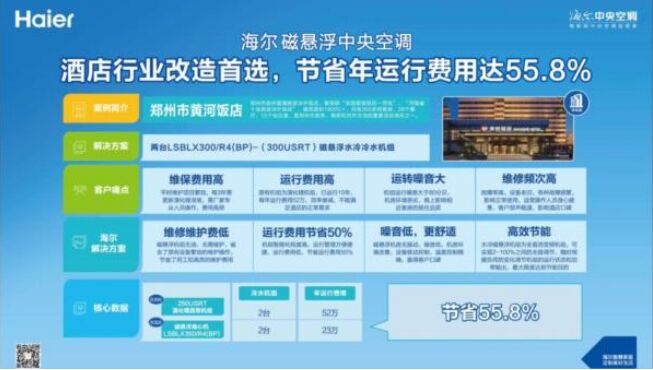 智慧節(jié)能 省電一半 原有空調體驗影響了酒店口碑,海爾通過改造方案實現(xiàn)了“雙贏”。原有機組為溴化鋰機組,已運行10年,效率衰減、噪音刺耳,故障頻發(fā)、維保費用高昂。海爾采用水冷磁懸浮機組進行改造,實現(xiàn)2%-100%無極變頻調節(jié),根據(jù)負荷變化調整冷量輸出。通過智能化機房管理,方便快捷、故障預警。既為酒店客人帶去安靜舒適的空調體驗,又為酒店運營方降低能耗,省電一半。 在體驗現(xiàn)場,用戶直觀感受到海爾磁懸浮機組的長效穩(wěn)定可靠。機組上方,1元硬幣立在紙牌塔尖屹立不倒。在講解人員手中,噪音分貝儀顯示數(shù)值為69,正常交流無障礙。在海爾E+物聯(lián)網(wǎng)磁懸浮空調的管理頁面上,嘉賓們看到,各項數(shù)據(jù)每隔6s自動記錄,機組運行狀態(tài)、能耗曲線及數(shù)據(jù)分析,都有不同界面進行云數(shù)據(jù)統(tǒng)計。 “提到磁懸浮,我們第一個想到的就是海爾!痹隗w驗結束后的交流討論中,有用戶表示,對噪音震動等可視化體驗印象深刻。在中央空調的選購過程中,尤為看中初期投資和運行費用,特別是節(jié)能運行。以海爾磁懸浮中央空調為核心的智慧節(jié)能解決方案,省電一半,既解決了節(jié)能降耗的難題,又通過智慧管理升級用戶體驗。