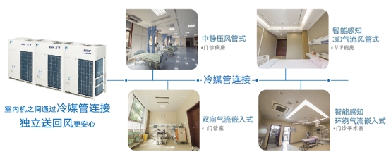 隨著疫情的控制城市也漸漸恢復(fù)生氣,在這一場(chǎng)曠日持久戰(zhàn)的疫戰(zhàn)中,抗疫第一線的醫(yī)院是至關(guān)重要的一環(huán)。大金空調(diào)注意到,作為現(xiàn)代建筑的呼吸系統(tǒng),醫(yī)院使用的空調(diào)、新風(fēng)系統(tǒng)在疫情期間也受到廣泛關(guān)注。 醫(yī)院空調(diào)、新風(fēng)設(shè)備的選型和設(shè)計(jì),原本就有著嚴(yán)格的國(guó)標(biāo)要求。在疫情期間,為了盡可能減少病毒傳播的可能性,“獨(dú)立送回風(fēng)”、“全新風(fēng)”、“負(fù)壓” 等成了新熱詞。那么結(jié)合這些熱點(diǎn),后疫情時(shí)代的醫(yī)院空調(diào)、新風(fēng)設(shè)備的選擇有哪些注意tips呢? 安心+1:“獨(dú)立送回風(fēng)”防止交叉感染 類似新冠病毒之類的呼吸類傳染疾病,其主要傳播途徑為呼吸飛沫、氣溶膠及密切接觸,感染幾率與空氣中病毒的濃度也有著直接關(guān)系,針對(duì)此種傳播方式,空調(diào)、新風(fēng)的設(shè)計(jì)變得尤為重要。 相較于走風(fēng)為主的變風(fēng)量中央空調(diào)系統(tǒng),大金VRV空調(diào)系統(tǒng)通過(guò)冷媒管的方式連接各臺(tái)空調(diào)室內(nèi)機(jī),不存在細(xì)菌/病毒滋生的環(huán)境;同時(shí)每個(gè)房間可以獨(dú)立送回風(fēng),不存在大范圍的空氣交換,最大程度力求避免細(xì)菌/病毒交叉感染的風(fēng)險(xiǎn)。