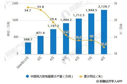 2018年1-8月中國風力發(fā)電量產(chǎn)量統(tǒng)計及增長情況