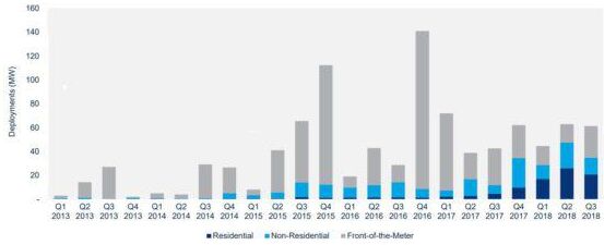 根據(jù)本周公布的最新美國(guó)能源存儲(chǔ)監(jiān)測(cè)報(bào)告,美國(guó)能源存儲(chǔ)項(xiàng)目在2018年翻了一番,達(dá)到32.9千兆瓦(GW)。