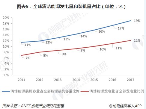 我國風(fēng)電并網(wǎng)裝機容量逐年提升 由于風(fēng)電行業(yè)技術(shù)的成熟,使得風(fēng)力發(fā)電,最終產(chǎn)生的電量能夠被使用成為可能。風(fēng)電行業(yè)近幾年在全球呈現(xiàn)多元化的發(fā)展趨勢,但是總體來看,風(fēng)電發(fā)電量和裝機量逐年呈現(xiàn)增長趨勢,全球清潔能源發(fā)電量(含水電)占全部發(fā)電量的比例由2011年的7%上升至2017年的12%;全球清潔能源裝機量(含水電)占全部裝機量的比例由2011年的11%上升至2017年的19%.