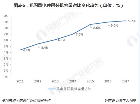近年來,風(fēng)電并網(wǎng)裝機容量在發(fā)電設(shè)備裝機總量中的占比不斷提高,整體呈現(xiàn)逐年上升的趨勢。我國風(fēng)電并網(wǎng)裝機容量占全部發(fā)電設(shè)備裝機容量的比例由2011年的4.4%上升至2017年的9.2%。根據(jù)國家統(tǒng)計局數(shù)據(jù)顯示,2017年,風(fēng)電發(fā)電量約為3057億千瓦時,約占全社會用電量的4.8%,風(fēng)力發(fā)電已成為我國清潔能源發(fā)電方式中不可缺少的一部分。 2017年我國風(fēng)電并網(wǎng)裝機容量占全部發(fā)電設(shè)備裝機容量的比例為9.2%,低于全球清潔能源裝機量(含水電)占全部裝機量的比例,去除水電部分,按單個國家來看,我國風(fēng)電并網(wǎng)裝機容量仍排在全球前列。