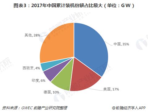 近年來我國風(fēng)電行業(yè)高速發(fā)展與國家政策的支持是密切相關(guān)的,曾出臺一系列補貼及促進平價上網(wǎng)措施等。在全球各國風(fēng)電累計裝機份額中,中國在全球風(fēng)電市場中占比最大,2017年累計裝機市場份額達35%,高于其他國家。在全球風(fēng)電行業(yè)市場份額格局中,我國已成“主戰(zhàn)場”。