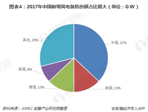 根據(jù)GWEC的數(shù)據(jù)顯示,2017年全球新增裝機容量為52.5GW。從新增裝機市場份額的占比來看,中國市場仍然為第一,占比約37%,高于排位第二的美國24個百分點。目前,我國風(fēng)電行業(yè)市場份額占比最大,并且新增裝機市場份額也最大,雙重保障,確保了我國市場為“主戰(zhàn)場”的地位不變。