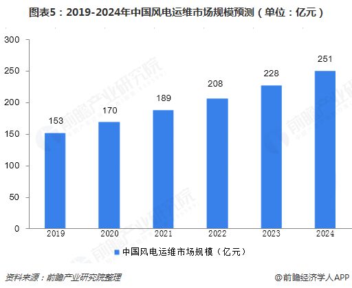 根據(jù)《風(fēng)電發(fā)展“十三五”規(guī)劃》,到2020年風(fēng)電累計(jì)裝機(jī)容量確保達(dá)到2.1億千瓦以上。從目前風(fēng)電裝機(jī)容量增速來看,風(fēng)電裝機(jī)增速已經(jīng)超過十三五規(guī)劃預(yù)計(jì)增速,年裝機(jī)容量增速保持在10%以上。同時(shí)隨著風(fēng)機(jī)運(yùn)行年限增長(zhǎng),大批風(fēng)機(jī)超過質(zhì)保期進(jìn)入運(yùn)維檢修期,維修需求大幅增長(zhǎng),風(fēng)電運(yùn)維未來市場(chǎng)規(guī)模仍將保持快速增長(zhǎng),預(yù)計(jì)到2019年風(fēng)電運(yùn)維市場(chǎng)規(guī)模達(dá)到153億元,到2024年行業(yè)市場(chǎng)規(guī)模達(dá)到251億元左右。