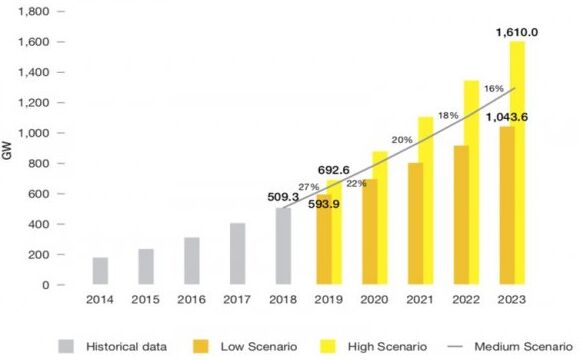 預(yù)測(cè)變化 在最新的預(yù)測(cè)研究中,SolarPower Europe估計(jì),到2022年,全球累計(jì)太陽能發(fā)電能力將在918GW至1346GW之間,中等情景預(yù)測(cè)為1117GW。這比去年的預(yù)測(cè)高出7%左右。2018年的預(yù)測(cè)介于824GW至1290GW之間,中等情景預(yù)測(cè)為1041GW。 該圖表顯示,在2019年至2023年期間,前五大光伏市場(chǎng)的裝機(jī)容量預(yù)計(jì)將達(dá)到多少。