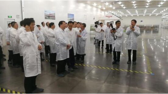 圖:李河君陪同龔正一行參觀漢能淄博基地工廠