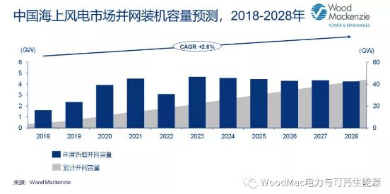 Wood Mackenzie(伍德麥肯茲)電力與可再生能源事業(yè)部近期發(fā)布最新報(bào)告《中國海上風(fēng)電市場展望2019-2028年》,詳細(xì)解讀未來十年新增裝機(jī)容量預(yù)測、政策機(jī)制、分省區(qū)發(fā)展預(yù)測、平準(zhǔn)化度電成本(LCOE)等內(nèi)容。 2020年將超額實(shí)現(xiàn)海上風(fēng)電裝機(jī)目標(biāo) 預(yù)計(jì)2019-2028年,中國海上風(fēng)電市場平均每年新增并網(wǎng)裝機(jī)4GW。海上風(fēng)電新增容量占年度新增總量的比重不斷提升,將從2019年的9%增加到2028年的18%。至2028年底,中國海上風(fēng)電市場累計(jì)并網(wǎng)容量將達(dá)到44GW,占中國風(fēng)電市場并網(wǎng)總量的10%。 江蘇與廣東將成為主力市場,預(yù)計(jì)兩省未來十年裝機(jī)容量共計(jì)將超過25GW,占全國新增總?cè)萘康?0%。至2020年,中國海上風(fēng)電市場累計(jì)并網(wǎng)容量將達(dá)到9.9GW,趕超能源局2020年海上風(fēng)電裝機(jī)目標(biāo)近一倍。
