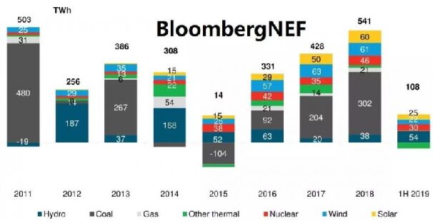 中國(guó)2019年經(jīng)濟(jì)增長(zhǎng)疲軟,能源板塊的增長(zhǎng)步伐也隨之放緩。然而,中國(guó)向清潔能源的轉(zhuǎn)型動(dòng)力依舊強(qiáng)勁:可再生能源發(fā)電、儲(chǔ)能、天然氣和新能源汽車都見證了強(qiáng)勁的增長(zhǎng),凸顯了中國(guó)加速低碳經(jīng)濟(jì)轉(zhuǎn)型的決心。 中國(guó)年度發(fā)電量的凈增量部分,按發(fā)電技術(shù)分類