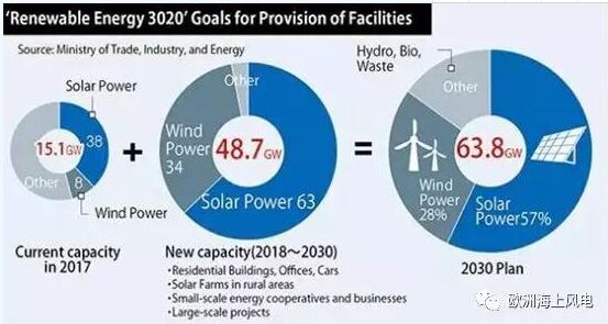 縱觀全球海上風電市場,歐洲地區(qū)裝機容量獨占鰲頭,但亞太地區(qū)絕對是未來最具潛力的市場。國際能源署(International Energy Agency)在其發(fā)布的報告中預(yù)測,到2050年,全球海上風電總裝機容量有望達到1000GW,其中,亞太地區(qū)占據(jù)了驚人的613GW! 而在亞洲的各個國家中,韓國無疑是最具潛力的新興市場——韓國政府的“可再生能源3020實施計劃”就是最好的證明。 規(guī)劃& 資源 韓國擁有良好的資源條件,盡管風速不高,但在東海與日本海海域仍有巨大的開發(fā)潛力。目前,韓國政府設(shè)定了一個到2040年將可再生能源的比例從目前的7%提高到35%的目標。其中,更有“可再生能源3020項目”的詳細目標。 2017年末,韓國政府提出“可再生能源3020實施計劃”,旨在實現(xiàn)能源轉(zhuǎn)型,其目標是到2030年,可再生能源占總能源消耗比例達到20%。為此需在2030年前新增4870萬千瓦可再生能源裝機容量,最終達到6380萬千瓦的總裝機規(guī)模,其中風電計劃占比28%,既1770萬千瓦(其中海上風電計劃約1300萬千瓦)。