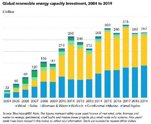 彭博社新能源財經(jīng)(BNEF)近日發(fā)布的年度數(shù)據(jù)顯示,2019年全球?qū)稍偕茉串a(chǎn)能的投資為2822億美元,較2018年的2802億美元增長1%,全球最大的市場(中國)有所回落,但其第二大市場(美國)創(chuàng)下了新紀錄。