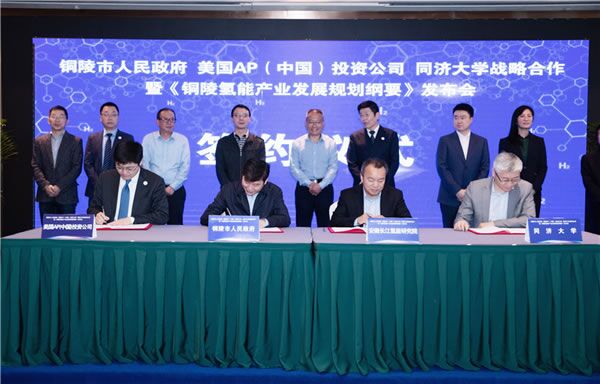 氫能長江,銅都起航。4月28日上午,銅陵市政府、美國AP(中國)投資公司、同濟大學戰(zhàn)略合作暨《銅陵氫能產業(yè)發(fā)展規(guī)劃綱要》發(fā)布會舉行,發(fā)布全省首個氫能產業(yè)發(fā)展規(guī)劃,安徽銅陵將建立全省首個落地的氫能產業(yè)世界五百強企業(yè)、全省首個氫能產業(yè)研究院。銅陵市委副書記、市長胡啟生致辭并揭牌,銅陵市領導程雙林、黃學龍;美國AP(中國)投資公司副總裁、氫能公司總經理郁峰,同濟大學燃料電池復合電源研究所所長張存滿等出席。副市長黃學龍主持。
