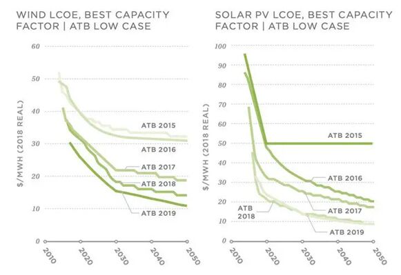圖為美國國家可再生能源實驗室的年度技術(shù)基準(zhǔn)(ATB)對未來風(fēng)能和太陽能的成本預(yù)測。從圖中可以看出,風(fēng)能和太陽能發(fā)電的成本下降速度一直都過預(yù)期。 “技術(shù)發(fā)展的速度通常被低估了,”加州大學(xué)伯克利分校的能源研究科學(xué)家AmolPhadke說,“在我的職業(yè)生涯中,我所有的預(yù)測都是保守的。”