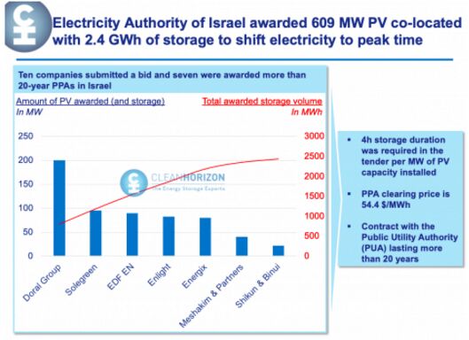 以色列電力管理局(PUA)在2020年底公布的最新招標(biāo)結(jié)果備受關(guān)注 以色列綠色能源協(xié)會表示,盡管受到疫情影響,但以色列電力管理局(PUA)仍然舉辦了此次拍賣活動,主要采購與電力系統(tǒng)相關(guān)的太陽能+儲能系統(tǒng)。 咨詢機(jī)構(gòu)CleanHorizon公司首席執(zhí)行官Michael Salomon表示,雖然以色列電力管理局(PUA)首批招標(biāo)活動只 采購了裝機(jī)容量為168MW太陽能發(fā)電設(shè)施和儲能容量為672MWh電池儲能系統(tǒng),但日前完成的拍賣活動將使以色列加快完成在2030年前部署2GW/8GWh儲能系統(tǒng)目標(biāo)。而以色列計劃到2030年實現(xiàn)30%電力來自可再生能源的目標(biāo),為此到2020年將部署裝機(jī)容量為12GW太陽能發(fā)電設(shè)施。 以色列電力管理局(PUA)監(jiān)管部門負(fù)責(zé)人YossiSokoler在CleanHorizon公司于去年11月舉辦的一次網(wǎng)絡(luò)研討會 中表示,8GWh是以色列電力管理局(PUA)為支持可再生能源發(fā)電所需的儲能部署建模目標(biāo)。 這些中標(biāo)項目必須在兩年半內(nèi)建成,能源資產(chǎn)所有者或開發(fā)商將通過政府支持的電力采購協(xié)議(PPA)獲得收益。以色列綠色能源協(xié)會表示,盡管可用的電網(wǎng)連接能力有限,但儲能系統(tǒng)可以使太陽能發(fā)電項目最大限度地發(fā)揮發(fā)電潛力。儲能系統(tǒng)還將幫助太陽能發(fā)電設(shè)施滿足夜間峰期電力需求。 該協(xié)會表示,雖然尚未像其他國家那樣配置為提供諸如頻率調(diào)節(jié)之類的電網(wǎng)服務(wù),但希望以后能夠做到這一點。 Salomon說,“以色列需要到2030年部署8GWh儲能系統(tǒng),而令人驚喜的是,以色列的最新拍賣活動中,儲能系統(tǒng)容量超過2.4GWh,并將在未來1~-3年內(nèi)通過長期電力采購協(xié)議(PPA)進(jìn)行部署。以色列電力管理局(PUA)舉辦的幾次拍賣活動使該國將部署的儲能系統(tǒng)的總儲能容量在未來幾年將達(dá)到3.3GWh。而2021年將啟動的下一輪拍賣的結(jié)果將非常值得關(guān)注,因此以色列可能很快達(dá)到2030年部署8GWh儲能系統(tǒng)目標(biāo)。”