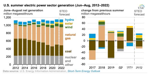 美國(guó)能源信息署預(yù)測(cè),2022年6月至8月期間,天然氣平均價(jià)格將接近每百萬(wàn)英熱單位9美元,這將是去年夏天平均價(jià)格的兩倍多。天然氣價(jià)格和可再生能源發(fā)電的增長(zhǎng)將會(huì)導(dǎo)致天然氣發(fā)電量減少。