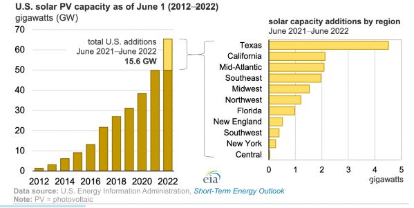 近年來(lái),美國(guó)風(fēng)能和太陽(yáng)能發(fā)電能力穩(wěn)步增長(zhǎng)。預(yù)計(jì)到6月初,美國(guó)電力部門將擁有65吉瓦的公用事業(yè)規(guī)模太陽(yáng)能發(fā)電能力,比去年同期增長(zhǎng)31%。幾乎三分之一的新太陽(yáng)能發(fā)電量將在德克薩斯州建設(shè)。今年6月,電力部門的上網(wǎng)風(fēng)電容量估計(jì)將達(dá)到138吉瓦,比去年6月增長(zhǎng)12%。