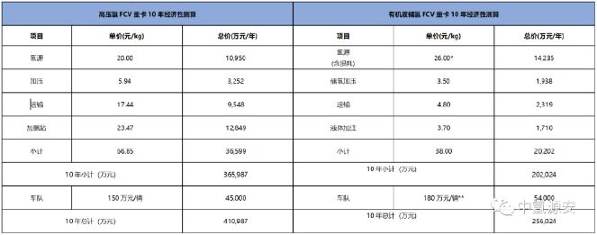 以“300輛重卡車隊(duì)”采購(gòu)、配套設(shè)施建設(shè)、運(yùn)營(yíng)投資為例測(cè)算,采用有機(jī)液儲(chǔ)氫技術(shù),免除了建設(shè)高壓加氫站的政策法規(guī)限制以及巨額固定資產(chǎn)投資成本,同時(shí)在車輛上不用安裝高壓氫氣瓶,也省去了特種設(shè)備定期檢驗(yàn)的成本,但需要在車輛上安裝一套有機(jī)液脫氫裝置,因此,車輛總成本高于傳統(tǒng)采用高壓氫氣瓶的燃料電池汽車,但全生命周期的綜合成本要低于采用高壓氫氣瓶的燃料電池汽車,具體情況如下表所示: