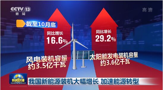 截至10月底,全國累計(jì)發(fā)電裝機(jī)容量約25億千瓦,同比增長8.3%。其中,風(fēng)電、太陽能發(fā)電裝機(jī)容量分別約3.5億千瓦和3.6億千瓦,分別同比增長16.6%和29.2%,保持快速增長。