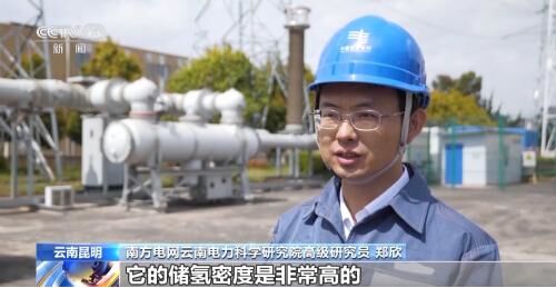 南方電網云南電力科學研究院高級研究員鄭欣:能夠儲存200立方米的氫氣,它的儲氫密度是非常高的,如果換成普通的常用的三個兆帕的儲氫罐,體積要增加20倍,可能這樣儲存的氫氣就要占滿這樣大半個場地的儲罐。