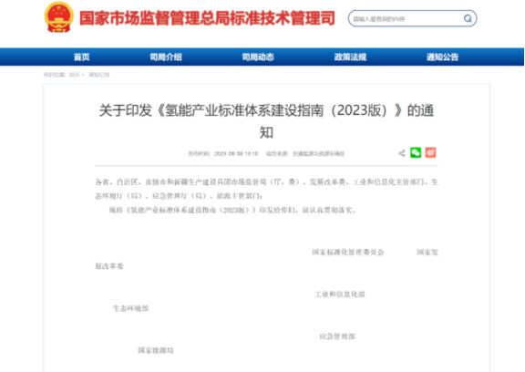 8月8日,國家標(biāo)準(zhǔn)化管理委員會、國家發(fā)展和改革委員會、工業(yè)和信息化部等六部門聯(lián)合印發(fā)《氫能產(chǎn)業(yè)標(biāo)準(zhǔn)體系建設(shè)指南(2023版)》,這是國家層面首個氫能全產(chǎn)業(yè)鏈標(biāo)準(zhǔn)體系建設(shè)指南。