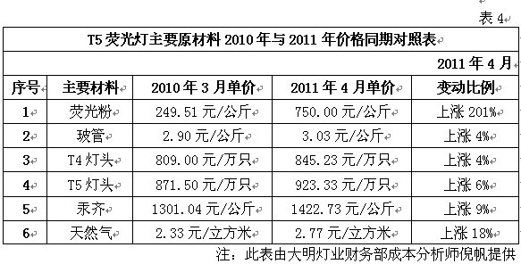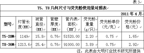 注:此表來源公共機(jī)構(gòu)節(jié)能“十二五”規(guī)劃征求意見稿 我們知道,規(guī)劃中所說的高效節(jié)能熒光燈實(shí)際上指的就是國家財(cái)政補(bǔ)貼推廣的T5熒光燈。有關(guān)方面預(yù)計(jì)此類光源十二五期間將占公共機(jī)構(gòu)單位使用率的50%以上。其它,如緊湊型熒光燈約占25%左右,金鹵燈約占15%左右,LED占約10%左右。 由此可見,在公共機(jī)構(gòu)的表率和示范作用下,在國家財(cái)政補(bǔ)貼推廣舉措的帶動(dòng)下,未來T5熒光燈將成為全社會(huì)照明領(lǐng)域的主體。 因素三.受產(chǎn)業(yè)政策與稀土熒光粉價(jià)格飆升的雙重影響,T8鹵粉熒光燈退出照明行業(yè)的速度將加快 根據(jù)中國照明電器協(xié)會(huì)提供的數(shù)據(jù)表明,目前全球白熾燈、鹵粉熒光燈和三基色節(jié)能熒光燈的應(yīng)用比例為4:3:1,我國約為8:9:1。其中三基色節(jié)能熒光燈是目前應(yīng)用技術(shù)最成熟的環(huán)保節(jié)能照明產(chǎn)品之一,也是當(dāng)前照明領(lǐng)域?qū)嵤┕?jié)能減排,加快淘汰白熾燈和T8低效熒光燈,實(shí)現(xiàn)節(jié)能照明的主要應(yīng)用和推廣對象。大家知道,目前制燈行業(yè)將低氣壓汞蒸汽熒光燈燈管按照熒光粉的成分將其劃分為鹵粉熒光燈、混合粉熒光燈和三基色熒光燈。鹵粉熒光燈的平均壽命在3000-4000小時(shí),混合粉熒光燈的平均壽命在4000-6000小時(shí),而三基色熒光燈的平均壽命最長,在10000小時(shí)以上。 我國是世界照明產(chǎn)品生產(chǎn)第一大國。2009年,我國白熾燈產(chǎn)量為27.3億只,熒光燈產(chǎn)量為35億只。因此,面對巨大的存量市場和增量市場,全球范圍內(nèi)淘汰白熾燈,推廣高效節(jié)能熒光燈的舉措,將帶動(dòng)我國高效節(jié)能熒光燈生產(chǎn)行業(yè)的快速發(fā)展。預(yù)計(jì)到2013年,我國白熾燈的產(chǎn)量將下降至14.2億只,高效節(jié)能熒光燈(主要包括T5雙端三基色熒光燈在內(nèi))的產(chǎn)量將達(dá)到70億只,是目前產(chǎn)量的2.25倍。 同時(shí),早在2008年6月1日,國家發(fā)改委、國家質(zhì)檢總局和國家認(rèn)監(jiān)委組織制定的《中華人民共和國實(shí)行能源效率標(biāo)識(shí)的產(chǎn)品目錄(第三批)》開始實(shí)施。其中,熒光燈達(dá)到3級能效以上才可以銷售,達(dá)到2級能效才能獲得節(jié)能認(rèn)證和國家產(chǎn)業(yè)政策支持。國外市場方面,歐盟于2009年9月1日開始執(zhí)行EUP指令。而按照現(xiàn)有鹵粉和混合粉熒光燈的性能指標(biāo)則很難達(dá)到2級能效標(biāo)準(zhǔn)。因此鹵粉熒光燈和混合粉熒光燈將逐步退出照明市場。如此,對我國照明行業(yè)的發(fā)展及其生產(chǎn)企業(yè)的重新定位必將產(chǎn)生極其深遠(yuǎn)的影響。 另外,隨著我國資源戰(zhàn)略產(chǎn)業(yè)結(jié)構(gòu)政策的調(diào)整,稀土原礦等產(chǎn)品被列入加工貿(mào)易禁止類商品目錄。同時(shí)隨著稀土發(fā)光材料市場容量的不斷增加,稀土價(jià)格漲幅明顯加快。目前其價(jià)格與2010年同期相比已飆升至2倍以上,業(yè)內(nèi)人士預(yù)計(jì)未來漲幅還會(huì)增加。表3和表4分別是T5、T8幾何尺寸與熒光粉使用量對照表及T5熒光燈主要原材料2010年與2011年價(jià)格同期對照表。據(jù)此試圖以T8熒光燈采用三基色粉維護(hù)現(xiàn)有產(chǎn)量優(yōu)勢的努力就更是難以實(shí)現(xiàn)了。所以說國家產(chǎn)業(yè)政策和熒光粉價(jià)格的變化將加速T8熒光燈退出照明市場的進(jìn)程。