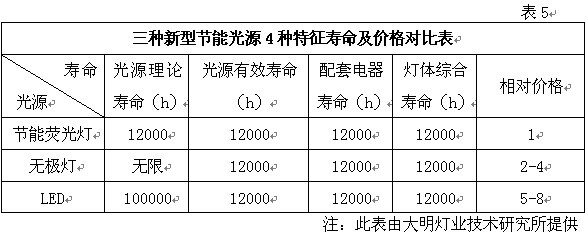因素四.技術(shù)成熟與優(yōu)良的性價(jià)比使T5高效熒光燈成為所有新型節(jié)能光源運(yùn)用之首 根據(jù)市場調(diào)研和有關(guān)資料表明,具備高光效、長壽命、高顯色性的新型光源主要是采用三基色熒光粉生產(chǎn)的節(jié)能熒光燈、LED和無極燈這三種產(chǎn)品。其中節(jié)能熒光燈中包含緊湊型熒光燈和T5雙端熒光燈。緊湊型用于替代白熾燈,而T5熒光燈則用于替代T8熒光燈。 表5是根據(jù)有關(guān)資料和實(shí)際使用狀況整理的三種新型節(jié)能光源的4種特征壽命及相對價(jià)格的對照表。