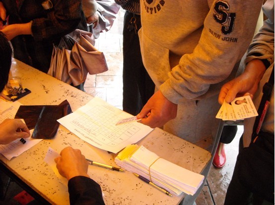 圖為:大明燈業(yè)推廣現(xiàn)場工作前臺社區(qū)居民持身份證踴躍購買大明T5高效照明產(chǎn)品