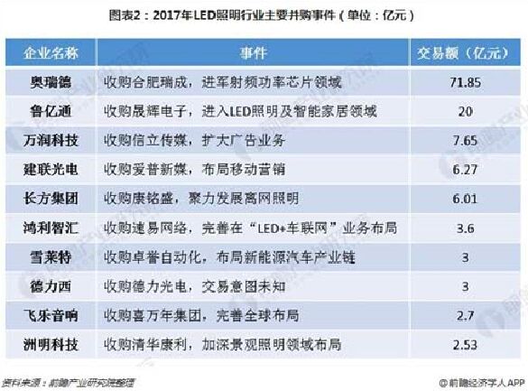 圖表2:2017年LED照明行業(yè)主要并購事件(單位:億元)
