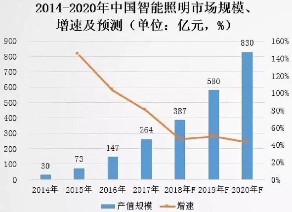 后照明時(shí)代,傳統(tǒng)通用照明遭遇增長(zhǎng)瓶頸。各大照明企業(yè)紛紛尋找新的增長(zhǎng)點(diǎn),其中智能照明所受關(guān)注度與日俱增。 GGII數(shù)據(jù)顯示,2017年,隨著技術(shù)發(fā)展、產(chǎn)品成熟、廠商積極推動(dòng)、智慧照明相關(guān)概念普及,中國(guó)智慧照明市場(chǎng)進(jìn)入高速發(fā)展階段,市場(chǎng)規(guī)模接近264億元,年成長(zhǎng)率達(dá)到80%。GGII預(yù)計(jì)2018年國(guó)內(nèi)LED智能照明市場(chǎng)規(guī)模將同比增長(zhǎng)46.6%,達(dá)到387億元,并且未來(lái)幾年國(guó)內(nèi)LED智能照明市場(chǎng)還將保持高速成長(zhǎng),2020年中國(guó)智能照明規(guī)模可達(dá)830億元。