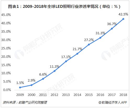 圖表1:2009-2018年全球LED照明行業(yè)滲透率情況(單位:%)