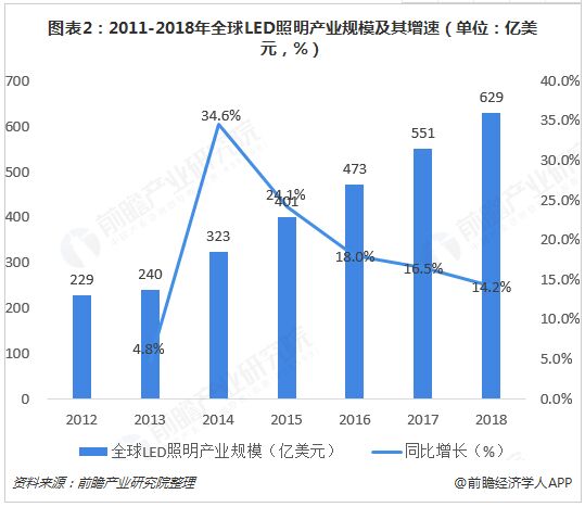 圖表2:2011-2018年全球LED照明產(chǎn)業(yè)規(guī)模及其增速(單位:億美元,%)