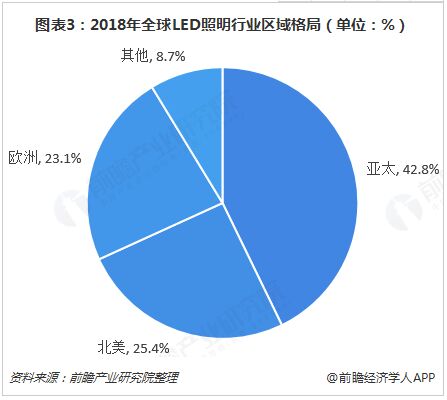 圖表3:2018年全球LED照明行業(yè)區(qū)域格局(單位:%)