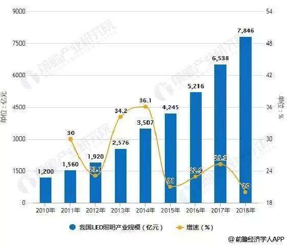 2014-2016年國內(nèi)LED照明應(yīng)用產(chǎn)值增長速度較快,LED照明產(chǎn)品國內(nèi)市場滲透率(LED照明產(chǎn)品國內(nèi)銷售量/照明產(chǎn)品國內(nèi)總銷售量)達到42%,較2015年上升10%。LED對傳統(tǒng)照明市場的替代效應(yīng)極大激發(fā)了半導(dǎo)體照明市場的需求,國內(nèi)半導(dǎo)體照明產(chǎn)業(yè)有望迎來關(guān)鍵的發(fā)展機遇。 先從下游封裝做起,逐步進入上游外延片生產(chǎn)。2000年開始加大了對高亮度四元芯片和GaN芯片的投資。中國先后啟動了綠色照明工程、半導(dǎo)體照明工程,在十大重點節(jié)能工程、高技術(shù)產(chǎn)業(yè)化示范工程、企業(yè)技術(shù)升級和結(jié)構(gòu)調(diào)整專項、863計劃新材料領(lǐng)域中先后支持半導(dǎo)體照明技術(shù)的研發(fā)和產(chǎn)業(yè)化項目,具備了較好的研發(fā)基礎(chǔ),初步形成了完整的產(chǎn)業(yè)鏈,并在下游集成應(yīng)用方面具有一定優(yōu)勢。 據(jù)《中國LED照明產(chǎn)業(yè)市場前瞻與投資戰(zhàn)略規(guī)劃分析報告》統(tǒng)計數(shù)據(jù)顯示,2010年中國LED照明產(chǎn)業(yè)規(guī)模已達1200億元,到了2015、2016年中國LED照明產(chǎn)業(yè)規(guī)模分別突破4000、5000億元。在政策的持續(xù)利好下,我國LED照明行業(yè)在經(jīng)歷了2015年的發(fā)展低谷與2016年的緩慢回升后,重新回歸發(fā)展快車道。截止至2017年中國LED照明產(chǎn)業(yè)規(guī)模持續(xù)擴大,增長至6538億元,同比增長25.35%,增速較前兩年顯著回升。初步測算2018年我國LED照明產(chǎn)業(yè)規(guī)模將達到7846億元左右,同比增長20%。