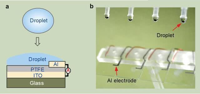 圖a是基于液滴的發(fā)電機(DEG)的示意圖。圖b是在玻璃基板上制造的四個平行的DEG器件的光學(xué)圖像。 香港城市大學(xué)/自然 圖