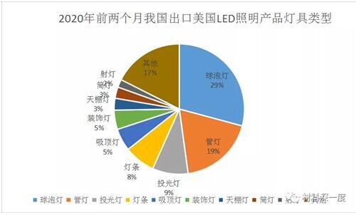 二、LED照明產(chǎn)品品類(lèi)出口(美國(guó))分布情況 從出口品類(lèi)結(jié)構(gòu)來(lái)看,2020年前兩月球泡燈(未列名燈具除外)依然占據(jù)出口的LED照明產(chǎn)品最大比重,占整體出口額的29%,其次是管燈、透光燈、燈條等,占整體出口額分列19%、9%、8%,相較于19年,產(chǎn)品品類(lèi)的占比出現(xiàn)重大變化變化,球泡燈出口占比上漲了12個(gè)百分點(diǎn),管燈出口占比超過(guò)了投光燈,同比上漲了6個(gè)百分點(diǎn),投光燈同比下滑了4個(gè)百分點(diǎn)。