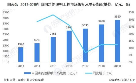 功能性照明:智能化是未來趨勢 2013-2019年,我國功能照明市場實現(xiàn)快速增長,從2013年的1320億元增長至2018年的3408億元,年均復(fù)合增速達到20.8%。2019年,行業(yè)市場規(guī)模進一步擴大,達到3825億元左右。