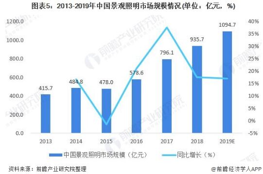 景觀性照明:市場規(guī)模迅速增長 進入21世紀(jì),科技發(fā)展日新月異,照明工程行業(yè)順應(yīng)節(jié)能環(huán)保的潮流,將高科技照明、節(jié)能照明等技術(shù)逐步應(yīng)用到照明技術(shù)中,同時隨著電子技術(shù)、光纖和導(dǎo)光管技術(shù)、投影技術(shù)、全息技術(shù)等的迅速發(fā)展及其在夜景照明中的應(yīng)用,城市夜景所用燈具更加豐富,使得我國景觀照明工程行業(yè)進入高速發(fā)展階段。 如今,我國已成為最大的景觀照明市場,景觀照明市場規(guī)模從2013年的415.7億元增長至2017年的796.1億元,期間年均復(fù)合增長率達21.22%。預(yù)計2019年行業(yè)規(guī)模將超1000億元。