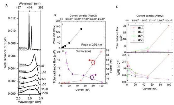 當(dāng)在實(shí)驗(yàn)中不斷加大電流時(shí),研究小組又有了一個(gè)驚人發(fā)現(xiàn)。雖然 LED 起初在一定波長范圍內(nèi)發(fā)光,但其最終會(huì)縮小為深紫色的兩個(gè)波長,他們的微型 LED 竟然變成了一個(gè)微小的激光器,實(shí)驗(yàn)記錄到的電流密度為 1000 kA/cm 2,LED 轉(zhuǎn)換為激光,亮度超過 20 微瓦。 “將 LED 轉(zhuǎn)換成激光需要很大的努力。通常,需要將 LED 耦合到諧振腔,諧振腔才能使光線反彈以產(chǎn)生激光! 尼古巴赫說!暗捠皆O(shè)計(jì)可以獨(dú)立完成全部工作!蔽⑿图す馄鞯膽(yīng)用也非常多,不僅在化學(xué)傳感方面,而且在下一代手持式通信產(chǎn)品、高清顯示器和消毒方面也是如此。 尼古巴赫認(rèn)為:“這種全新 LED 設(shè)計(jì)作為重要的構(gòu)建基塊具有很大的潛力! “雖然這不是人們制造的最小的激光器,但它是一個(gè)非常明亮的激光器,且不存在效率下降的問題,將會(huì)大有用處! 研究結(jié)論中指出,這項(xiàng)發(fā)現(xiàn)令人鼓舞,代表了 LED 設(shè)計(jì)體系結(jié)構(gòu)的重要一步,可以克服 LED 中的 “電流密度下降” 和“溫度下降”效應(yīng),以最大化其每個(gè)像素可實(shí)現(xiàn)的輸出功率。