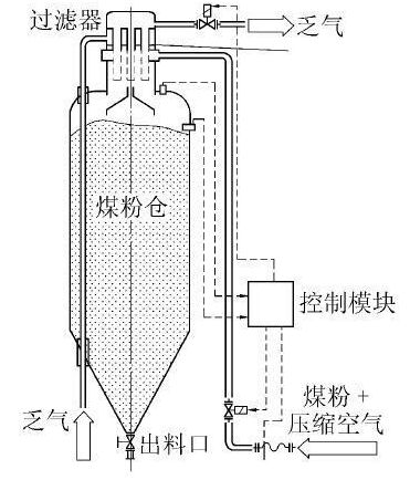目前國內(nèi)多數(shù)從業(yè)廠商缺乏煤粉存儲安全知識,在設(shè)計、安裝煤粉儲存塔(罐) 時存在重大的安全隱患,如將煤粉儲塔(罐) 置于全封閉建筑物內(nèi),有發(fā)生自燃甚至爆炸的危險。為了保證煤粉工業(yè)鍋爐行業(yè)健康有序發(fā)展,應(yīng)圍繞在密閉空間內(nèi)煤粉的自燃發(fā)火特性開展研究,為形成煤粉儲罐完整的自主安全技術(shù)規(guī)范提供理論依據(jù)。 1.3濃相煤粉輸送技術(shù) 供料器是煤粉工業(yè)鍋爐中最為主要的設(shè)備,具備無脈動、高固氣比連續(xù)穩(wěn)定地給燃燒器供料的功能。供料不穩(wěn)定,極易發(fā)生爐膛爆燃事故,為了保證鍋爐穩(wěn)定運行,供料偏差不得超過±3% 。近年來,國內(nèi)自主煤粉供料技術(shù)主要有3類: ①借鑒電站鍋爐系統(tǒng)的供料設(shè)備,如葉輪給粉機; ②粉體輸送設(shè)備,如(改良) 螺旋輸送機; ③引進國外的技術(shù)產(chǎn)品,如氣錐結(jié)合鎖氣閥。前2類均為稀相供料,固(煤粉) 氣(空氣) 比一般小于 0.3 kg/m3,初始點火困難,不適合應(yīng)用于煤粉工業(yè)鍋爐領(lǐng)域。只有第3類為濃相供料,具備快速著火的條件,可應(yīng)用于煤粉工業(yè)鍋爐領(lǐng)域。 隨著對煤粉流動特性認識的不斷深入,供料器從螺旋結(jié)構(gòu)形式升級為主動二次活化式。主動供料器的形式包括“星鳥”耦合文丘里(圖2) 、多孔雙轉(zhuǎn)盤及轉(zhuǎn)子秤等。煤粉經(jīng)過底部星型卸料閥周期性地卸入到中間緩沖倉,中間緩沖倉錐斗壁面多點通氣,使煤粉吸氣快速活化,流動性顯著增強。密度分布均一的煤粉流,依靠重力經(jīng)錐斗出口進入“星鳥”耦合文丘里閥組。閥組連續(xù)均勻排出的煤粉落入高速引射流混合器組件,與一次風(fēng)瞬間完成散射混合,形成高濃度風(fēng)粉流。風(fēng)粉流依靠一次風(fēng)機提供的動力,經(jīng)風(fēng)粉管道源源不斷濃相送出,進入下游燃燒器!靶区B”耦合文丘里具備二次活化、均勻連續(xù)喂料以及引射流混合發(fā)送的特點,試驗表明在供料速率2.4~4.0t/h 的工況下,“星鳥”耦合文丘里供料偏差為±1% 。