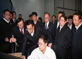 李克強(qiáng)副總理(前排中央)在應(yīng)用材料公司SunFab太陽(yáng)能組件可靠性測(cè)試中心認(rèn)真觀看工程師演示復(fù)雜的太陽(yáng)能面板性能測(cè)試過(guò)程。陪同參觀的還有:陜西省省長(zhǎng)袁純清(前排右二)、西安市市委書記孫清云(前排右一)、應(yīng)用材料投資(中國(guó))有限公司總裁關(guān)悅生(前排右三)、應(yīng)用材料西安公司總經(jīng)理鄒鋼(前排左二)。
